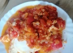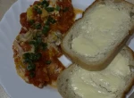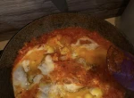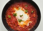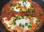 Cebulę i czosnek obieramy i kroimy w kostkę. Na patelni rozgrzewamy oliwę, podsmażamy na niej kumin, do momentu, aż zacznie ładnie pachnieć. Dodajemy następnie czosnek i cebulę, smażymy aż cebula będzie lekko szklista. Teraz dodajemy pomidory, płatki chili i sól. Smażymy bez przykrycia, aż pomidory lekko odparują. W pomidorach robimy dwa zagłębienia i w każde wbijamy po jajku. Teraz na małym ogniu dusimy wszystko razem (można pod przykryciem), aż białko się zetnie, a żółtko będzie miękkie. Posypujemy grubo posiekaną natką pietruszki i od razu podajemy.
