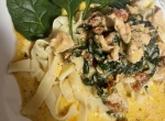 Tagliatelle z pesto, szparagami, pieczoną czerwoną papryką i liśćmi szpinaku