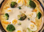 Ciasto rozwałkowujemy na grubość ok. 0,5 cm, podsypując mąką. Ciastem wykładamy dno i boki formy ceramicznej. Widelcem nakłuwamy ciasto, aby nam się nie podniosło. Wstawiamy do piekarnika na ok. 20 min. Do wysokiego naczynia wlewamy śmietanę, dodajemy jajka, ser żółty, serek topiony, koperek i dokładnie mieszamy. Na podpieczone, lekko wystudzone ciasto układamy przekrojone na połowę jajka (żółtkami do góry), pomiędzy dodajemy brokuły, kilka oliwek i pieczarek.