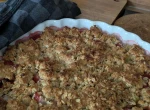 Nadzienie: Płatki wsypać do miski, dodać cukier trzcinowy i drobno pokrojonego banana. Wymieszać i wyłożyć na lekko podpieczonym owsianym spodzie. Owoce umyć i pokroić na mniejsze kawałki (śliwki i truskawki na pół, rabarbar obrać i pokroić na małe kawałki). Na płatkach owsianych wyłożyć owoce (jeżeli macie mrożone, to wlać również sok), masło stopić z cukrem trzcinowym i polać nim równomiernie całą tartę. Włożyć do piekarnika (nadal rozgrzanego do 200°C) i piec 40 minut. Upieczoną tartę wyciągnąć z piekarnika i zostawić do ostudzenia.