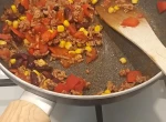 Wszystkie składniki na ciasto wymieszaj w misce i dokładnie zagnieć. Gdy nie będzie się kleiło do rąk, zawiń w papier i włóż do lodówki na co najmniej 30 minut. Po upływie czasu ciasto rozwałkuj, przełóż do foremki i piecz w 180 °C przez 10-15 minut. W tym czasie przygotuj farsz. Papryki pokrój w drobną kostkę. Fasolę i kukurydzę odcedź, a następnie przepłukaj pod bieżącą wodą. W dużej misce wymieszaj mięso mielone, fasolę, kukurydzę, pomidory oraz papryki. Całość dopraw do smaku pieprzem, chilli, kolendrą i solą. Na ciepły spód wyłóż równomiernie farsz i piecz kolejne 15 minut. Na 5 minut przed końcem pieczenia wierzch posyp tartym żółtym serem.