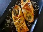 Ciasto francuskie rozciągamy, wykładamy je na blaszkę. Śmietankę mieszamy z jajkiem, doprawiamy solą i pieprzem, wlewamy na spód. Ser pleśniowy kroimy w plasterki, układamy na sosie.