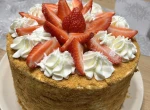Wyłóż 1/3 masy śmietankowej, a na niej poukładaj truskawki. Na wierzch połóż kolejny blat tortu, nasącz 1/2 szklanki lemoniady. Wyłóż 1/3 masy śmietankowej, warstwę truskawek, przykryj ostatnim blatem biszkoptu i namocz resztą lemoniady. Wierzch i boki wysmaruj pozostałą masą śmietankową.