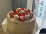 Boki tortu posyp wiórkami kokosowymi. Wierzch udekoruj truskawkami. Odstaw do schłodzenia do lodówki.