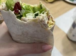 Tortilla z kawałkami piersi z kurczaka oraz warzywami: pomidorami, ogórkiem, kukurydzą oraz sosem majonezowo-ketchupowym.