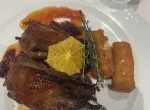 Udko z kaczki glazurowane mandarynką z ziemniaczkami i liśćmi botwinki