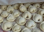 Ciasto rozciągnij delikatnie w palcach, wypełnij niewielką ilością farszu mięsnego i złóż na pół, a następnie zlep ze sobą oba końce.