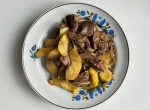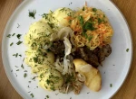 Dodaj podsmażone jabłka i cebulkę, dopraw całość majerankiem, odrobiną soli i pieprzem, przykryj i duś wszystko jeszcze przez około 2 minuty.