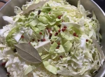Kapustę kiszoną pokrój w krótsze wstęgi (jeśli jest zbyt kwaśna, opłucz w zimnej wodzie i dokładnie odciśnij). Białą kapustę obierz z zewnętrznych liści, posiekaj i posól, następnie odstaw na ok. 30 minut.