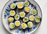 Na małą bambusową matę połóż płat nori, rozsmaruj ugotowany ryż na około połowie jego powierzchni. Na ryż układaj paski przygotowanych warzyw oraz serek Philadephia.