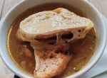 Dodać rosół i wino, nałożyć pokrywę i zagotować w podany sposób. Dodatkowo doprawić zupę solą i pieprzem i rozlać do bulionówek. Pociąć chleb tostowy na małe kostki i rozdzielić do bulionówek. Przykryć zupę serem i zapiec w podany sposób.