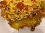 Pieczarki poszatkować, paprykę pokroić w makaroniki (paseczki) cebulę pokroić w kostkę, czosnek przecisnąć przez praskę. Podsmażyć na 2-3 łyżkach oleju. Dodać pieczarki i paprykę i tymianek. Dusić do miękkości. Wędlinę drobniutko posiekać. Ugotowany makaron wymieszać z grzybową masą oraz wędliną. Dodać ketchup, doprawić do smaku. Formę natłuścić, wysypać bułką tartą, na blaszkę wyłożyć makaronową masę. Jajka zmiksować z serem feta, zalać makaron. Piec w rozgrzanym piekarniku 45-60min. Do uzyskania złotej skórki.