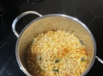 - Do zeszklonej cebuli dodaj pokrojone mięso, oprósz je mąką ryżową, pieprzem i solą.