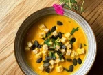 Następnie wszystkie warzywa wraz z wyciśniętym czosnkiem z łupinek blendujemy w garnku wraz z bulionem. Całość doprawiamy solą i pieprzem. Podajemy z prażonymi pestkami dyni i słonecznika.