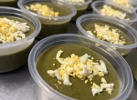 Czosnek w całości (bez obierania) pieczemy w piekarniku 10 min w 200°C. Pozostawiamy do przestygnięcia. W garnku zagotowujemy bulion i dodajemy ząbki czosnku. Cebulę kroimy w kostkę, pory w plasterki. Na patelni rozgrzewamy olej i podsmażamy na nim cebulę z porami. Dodajemy tymianek i całość zalewamy winem. Podgrzewamy ok. 4 min, alkohol nam wyparuje. Cebulę z porami przekładamy do bulionu z czosnkiem i gotujemy, aż warzywa będą bardzo miękkie. Wszystko miksujemy za pomocą blendera do uzyskania jednolitej kremowej konsystencji. Doprawiamy solą i pieprzem do smaku. Groszek wystarczy zalać gorącą wodą i odstawić na 4 min. Odcedzamy. Zupę krem podajemy z groszkiem i startym serem camembert.
