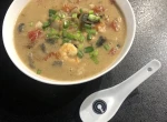 - W woku lub dużym garnku rozgrzej olej i podsmaż czosnek, imbir oraz grzyby. Po około 5 minutach całość zalej bulionem. Po chwili dodaj mleko kokosowe, sos rybny oraz pastę Tom Yum.